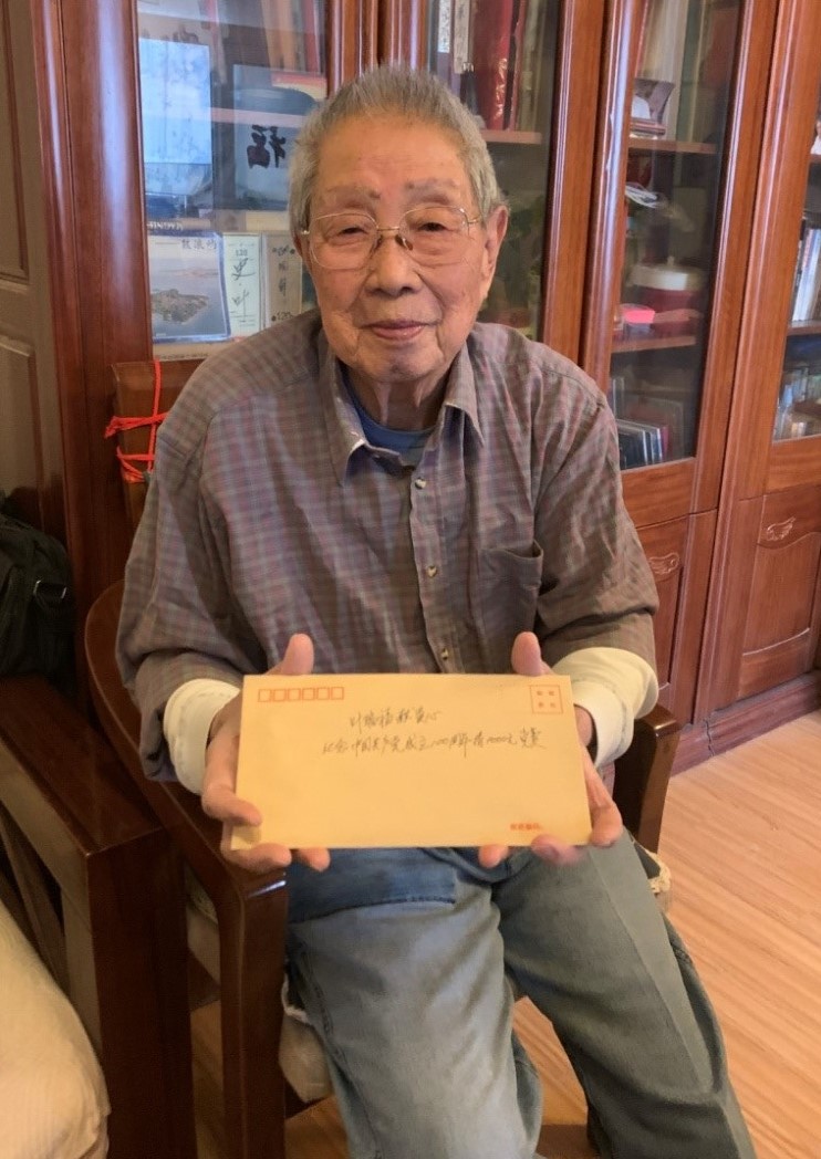 在走訪慰問過程中,黃曉華與葉瑞福親切交談,感謝他幾十年來為集團(tuán)公司文化宣傳事業(yè)做出的貢獻(xiàn),同時(shí)感謝他在2020年向集團(tuán)捐贈(zèng)一批多年珍藏的歷史資料。今年89歲的葉瑞福是傷殘退伍軍人,是集團(tuán)原中演公司宣傳、資料管理方面負(fù)責(zé)人,承擔(dān)演出項(xiàng)目的宣傳及藝術(shù)檔案等工作。慰問過程中,葉瑞福同志拿出早已準(zhǔn)備好的兩個(gè)信封交給隨黃書記一同前往的工作人員,一個(gè)信封里裝有他本人2021年黨費(fèi),另一個(gè)信封裝有為慶祝中國(guó)共產(chǎn)黨成立100周年繳納的特殊黨費(fèi)1000元,以表達(dá)對(duì)黨的感激之情,向黨獻(xiàn)禮。